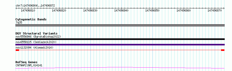 Variant DetailsVariant: nsv1132094| Internal ID | 19273010 | | Landmark | | | Location Information | | | Cytoband | 7q35 | | Allele length | | Assembly | Allele length | | hg38 | 67 | | hg19 | 67 |