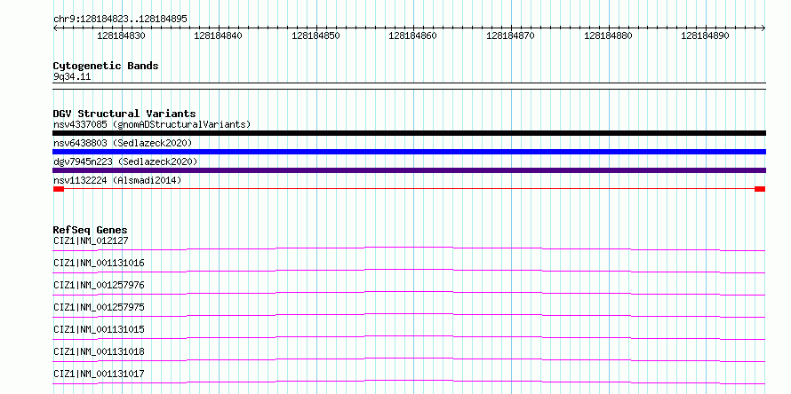 Variant DetailsVariant: nsv1132224| Internal ID | 19268290 | | Landmark | | | Location Information | | | Cytoband | 9q34.11 | | Allele length | | Assembly | Allele length | | hg38 | 73 | | hg19 | 73 |