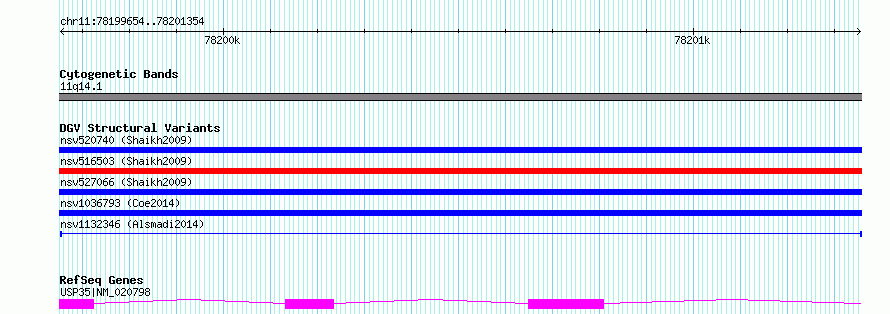 Variant DetailsVariant: nsv1132346| Internal ID | 19273766 | | Landmark | | | Location Information | | | Cytoband | 11q14.1 | | Allele length | | Assembly | Allele length | | hg38 | 1701 | | hg19 | 1701 |