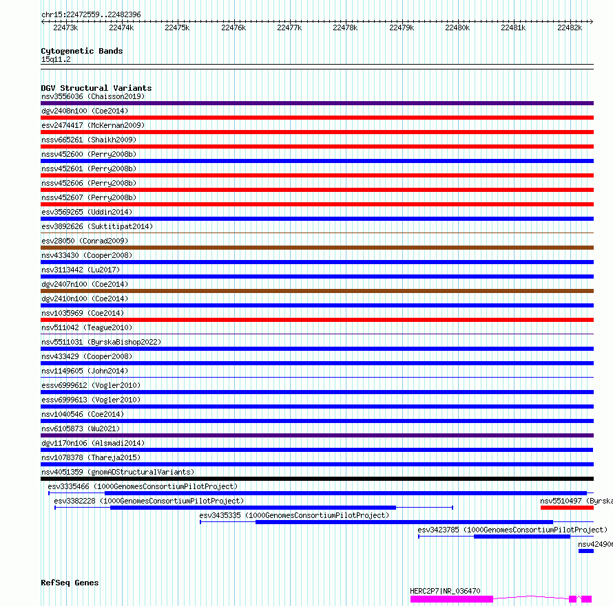Variant DetailsVariant: nsv1132407| Internal ID | 19271707 | | Landmark | | | Location Information | | | Cytoband | 15q11.2 | | Allele length | | Assembly | Allele length | | hg38 | 9838 | | hg19 | 10101 |