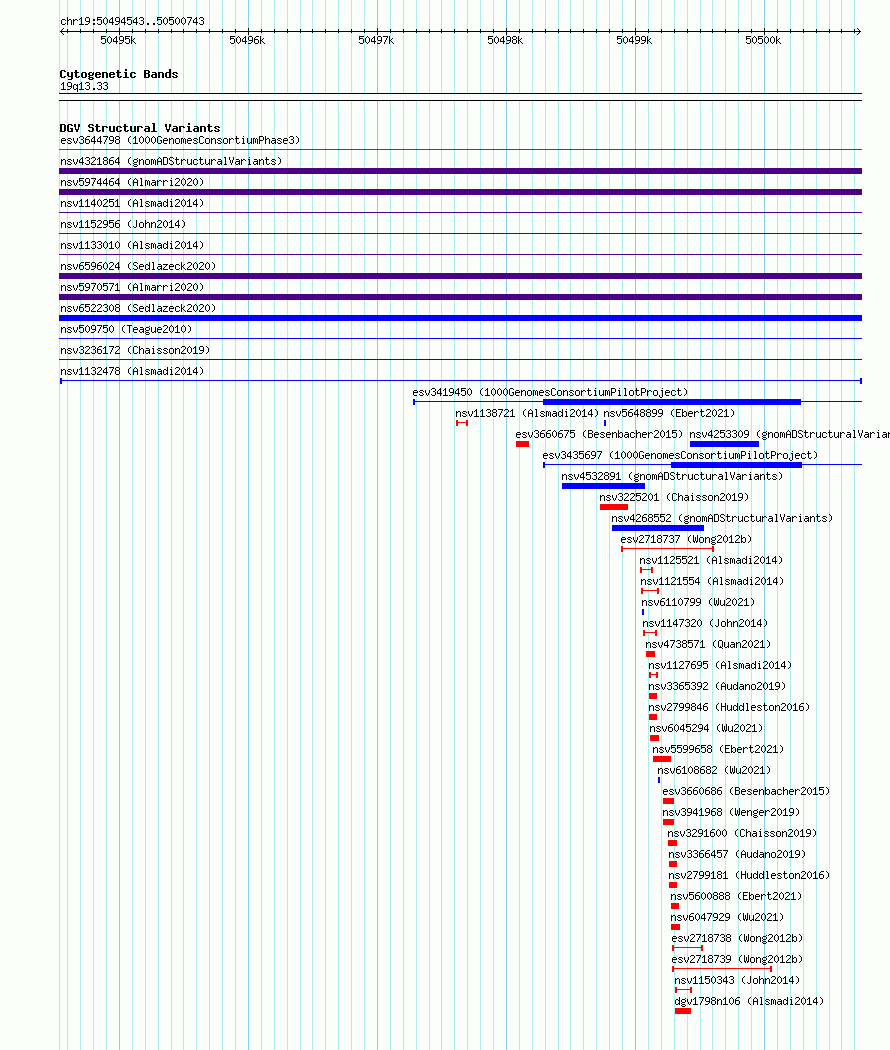 Variant DetailsVariant: nsv1132478| Internal ID | 19261702 | | Landmark | | | Location Information | | | Cytoband | 19q13.33 | | Allele length | | Assembly | Allele length | | hg38 | 6201 | | hg19 | 6201 |
