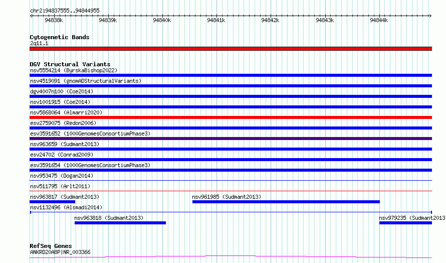 Variant DetailsVariant: nsv1132496| Internal ID | 19254236 | | Landmark | | | Location Information | | | Cytoband | 2q11.1 | | Allele length | | Assembly | Allele length | | hg38 | 7401 | | hg19 | 7401 |