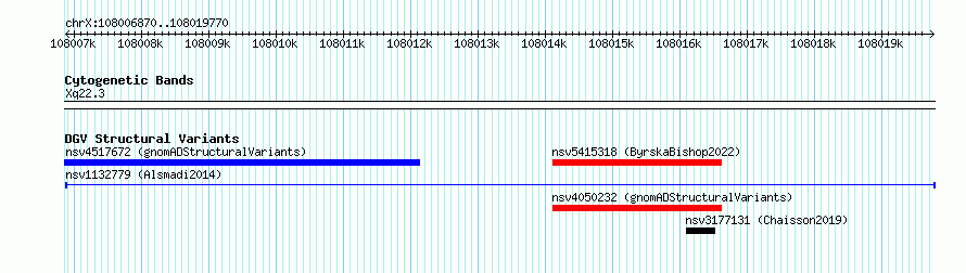 Variant DetailsVariant: nsv1132779| Internal ID | 19260719 | | Landmark | | | Location Information | | | Cytoband | Xq22.3 | | Allele length | | Assembly | Allele length | | hg38 | 12901 | | hg19 | 12901 |