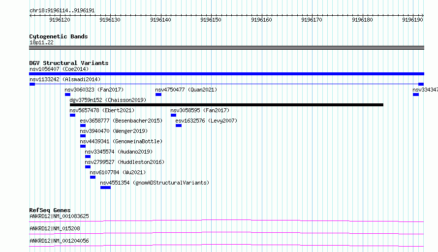 Variant DetailsVariant: nsv1133242| Internal ID | 19248927 | | Landmark | | | Location Information | | | Cytoband | 18p11.22 | | Allele length | | Assembly | Allele length | | hg38 | 78 | | hg19 | 78 |