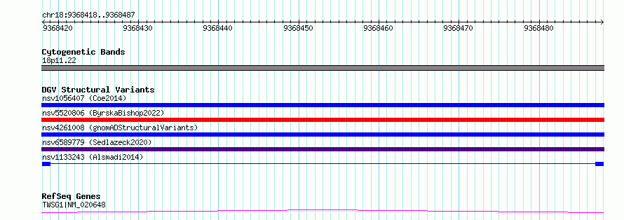 Variant DetailsVariant: nsv1133243| Internal ID | 19252533 | | Landmark | | | Location Information | | | Cytoband | 18p11.22 | | Allele length | | Assembly | Allele length | | hg38 | 70 | | hg19 | 70 |