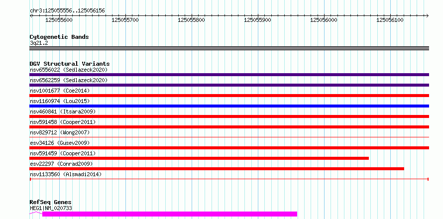 Variant DetailsVariant: nsv1133560| Internal ID | 19265647 | | Landmark | | | Location Information | | | Cytoband | 3q21.2 | | Allele length | | Assembly | Allele length | | hg38 | 601 | | hg19 | 601 |