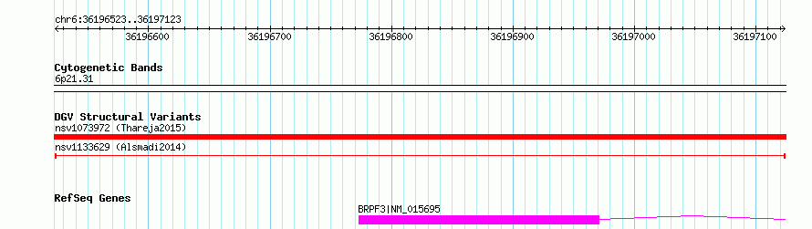 | Variant Type | CNV deletion | Copy Number | | Allele State | | Allele Origin | | Probe Count | | Validation Flag | | Merged Status | M | Merged Variants | | Supporting Variants | nssv3969193 | Samples | KWS2 | Known Genes | BRPF3 | Method | Sequencing | Analysis | HugeSeq | Platform | Illumina HiSeq 2000 | Comments | | Reference | Alsmadi_et_al_2014 | Pubmed ID | 24896259 | Accession Number(s) | nsv1133629
