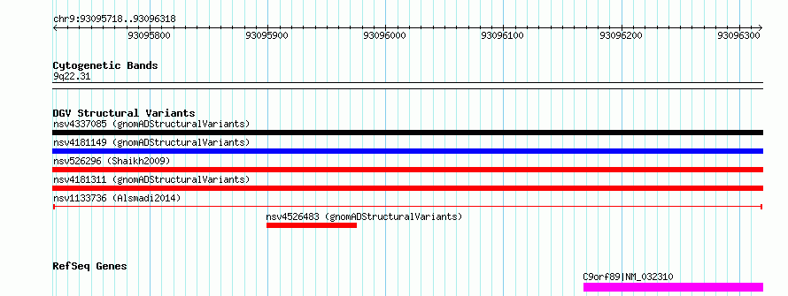 Variant DetailsVariant: nsv1133736| Internal ID | 19248229 | | Landmark | | | Location Information | | | Cytoband | 9q22.31 | | Allele length | | Assembly | Allele length | | hg38 | 601 | | hg19 | 601 |