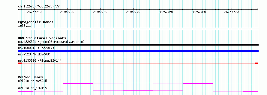 Variant DetailsVariant: nsv1133826| Internal ID | 19277392 | | Landmark | | | Location Information | | | Cytoband | 1p36.11 | | Allele length | | Assembly | Allele length | | hg38 | 73 | | hg19 | 73 |