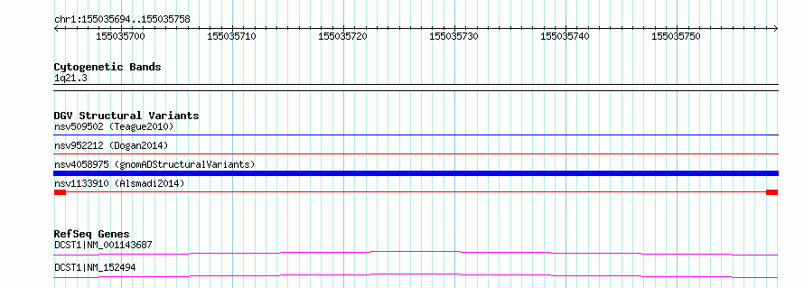 | | Variant Type | CNV deletion | | Copy Number | | | Allele State | | | Allele Origin | | | Probe Count | | | Validation Flag | | | Merged Status | M | | Merged Variants | | | Supporting Variants | nssv3970231 | | Samples | KWS2 | | Known Genes | DCST1 | | Method | Sequencing | | Analysis | HugeSeq | | Platform | Illumina HiSeq 2000 | | Comments | | | Reference | Alsmadi_et_al_2014 | | Pubmed ID | 24896259 | | Accession Number(s) | nsv1133910