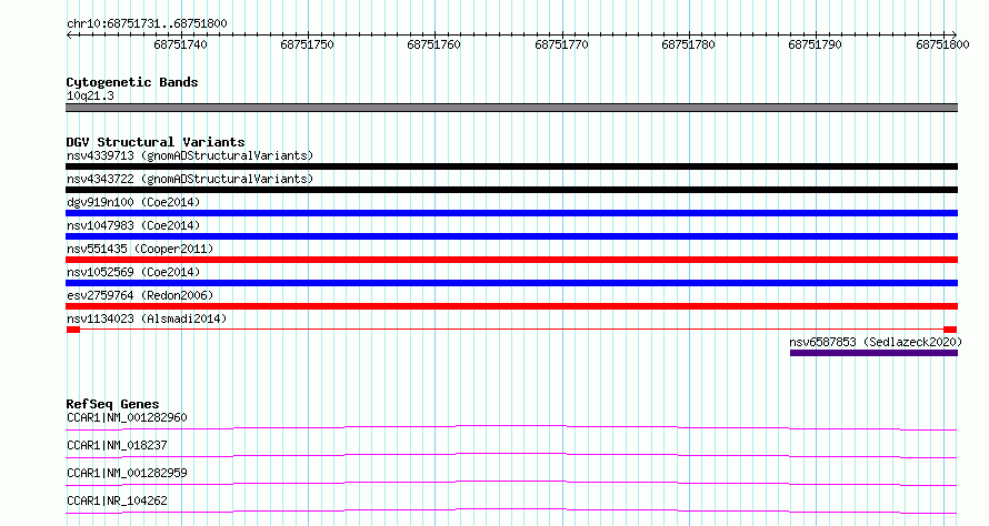 Variant DetailsVariant: nsv1134023| Internal ID | 19263596 | | Landmark | | | Location Information | | | Cytoband | 10q21.3 | | Allele length | | Assembly | Allele length | | hg38 | 70 | | hg19 | 70 |