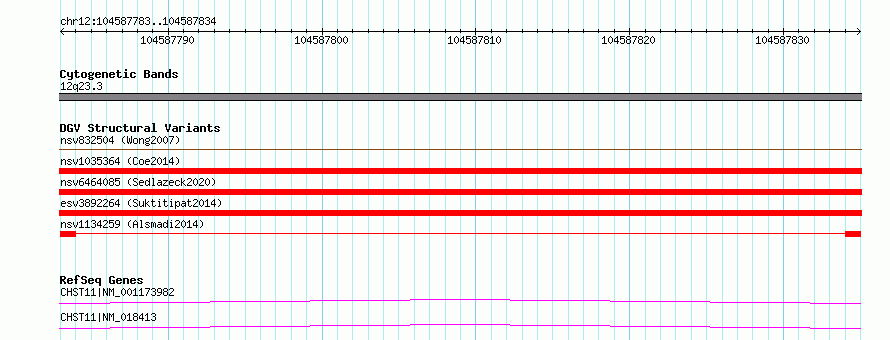 Variant DetailsVariant: nsv1134259| Internal ID | 19281444 | | Landmark | | | Location Information | | | Cytoband | 12q23.3 | | Allele length | | Assembly | Allele length | | hg38 | 52 | | hg19 | 52 |
