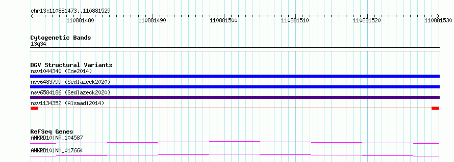 Variant DetailsVariant: nsv1134352| Internal ID | 19265201 | | Landmark | | | Location Information | | | Cytoband | 13q34 | | Allele length | | Assembly | Allele length | | hg38 | 57 | | hg19 | 57 |