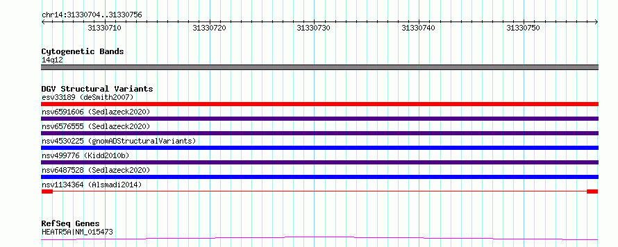Variant DetailsVariant: nsv1134364| Internal ID | 19253472 | | Landmark | | | Location Information | | | Cytoband | 14q12 | | Allele length | | Assembly | Allele length | | hg38 | 53 | | hg19 | 53 |