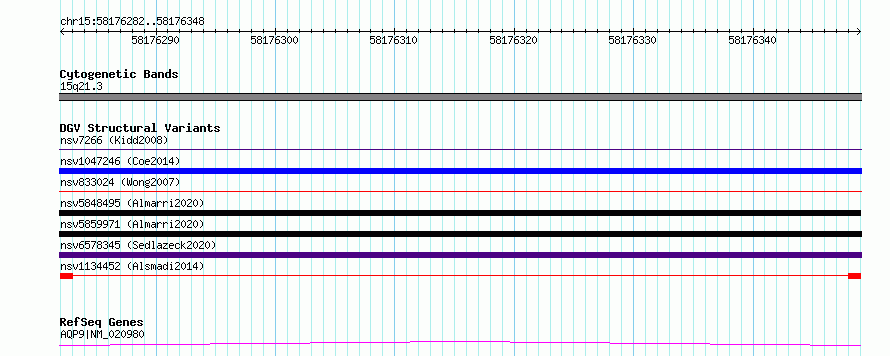 Variant DetailsVariant: nsv1134452| Internal ID | 19273925 | | Landmark | | | Location Information | | | Cytoband | 15q21.3 | | Allele length | | Assembly | Allele length | | hg38 | 67 | | hg19 | 67 |