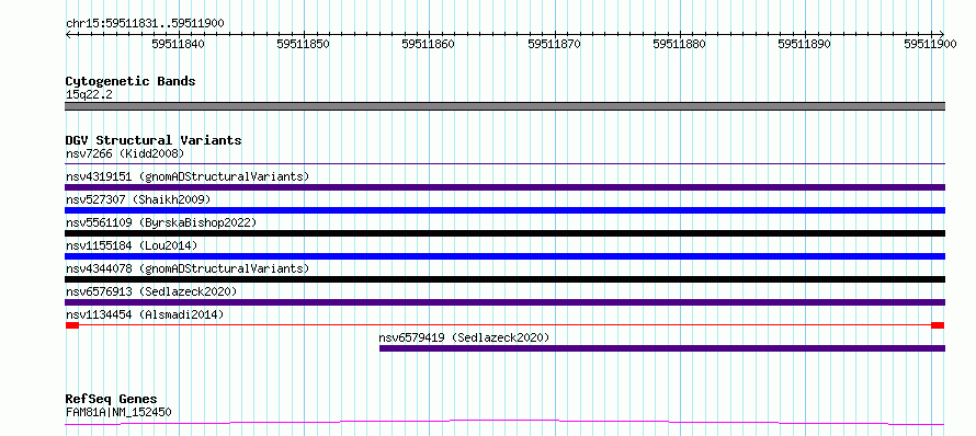 Variant DetailsVariant: nsv1134454| Internal ID | 19265939 | | Landmark | | | Location Information | | | Cytoband | 15q22.2 | | Allele length | | Assembly | Allele length | | hg38 | 70 | | hg19 | 70 |