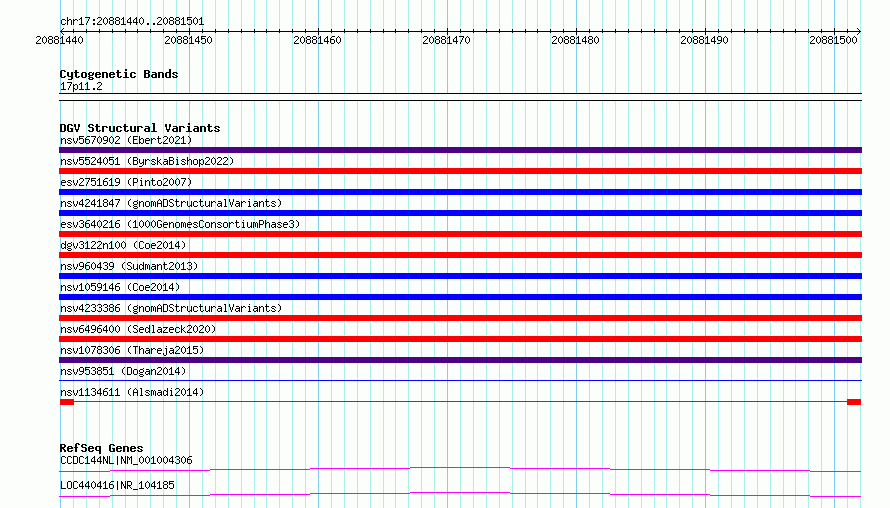 Variant DetailsVariant: nsv1134611| Internal ID | 19282413 | | Landmark | | | Location Information | | | Cytoband | 17p11.2 | | Allele length | | Assembly | Allele length | | hg38 | 62 | | hg19 | 62 |
