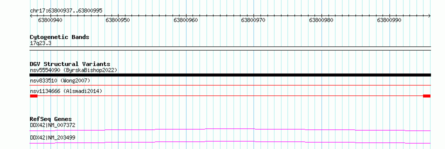Variant DetailsVariant: nsv1134666| Internal ID | 19279565 | | Landmark | | | Location Information | | | Cytoband | 17q23.3 | | Allele length | | Assembly | Allele length | | hg38 | 59 | | hg19 | 59 |