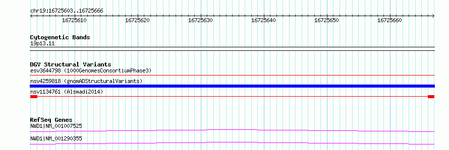 Variant DetailsVariant: nsv1134761| Internal ID | 18909557 | | Landmark | | | Location Information | | | Cytoband | 19p13.11 | | Allele length | | Assembly | Allele length | | hg38 | 64 | | hg19 | 64 |