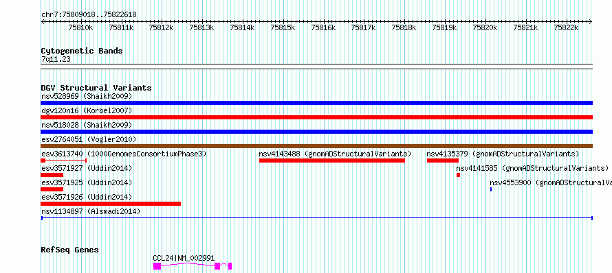 Variant DetailsVariant: nsv1134897| Internal ID | 18923424 | | Landmark | | | Location Information | | | Cytoband | 7q11.23 | | Allele length | | Assembly | Allele length | | hg38 | 13601 | | hg19 | 13601 |