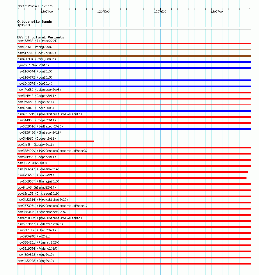 Variant DetailsVariant: nsv1134959| Internal ID | 19275156 | | Landmark | | | Location Information | | | Cytoband | 1p36.33 | | Allele length | | Assembly | Allele length | | hg38 | 411 | | hg19 | 411 |