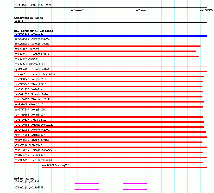 Variant DetailsVariant: nsv1134963| Internal ID | 19273351 | | Landmark | | | Location Information | | | Cytoband | 1q21.3 | | Allele length | | Assembly | Allele length | | hg38 | 297 | | hg19 | 297 |