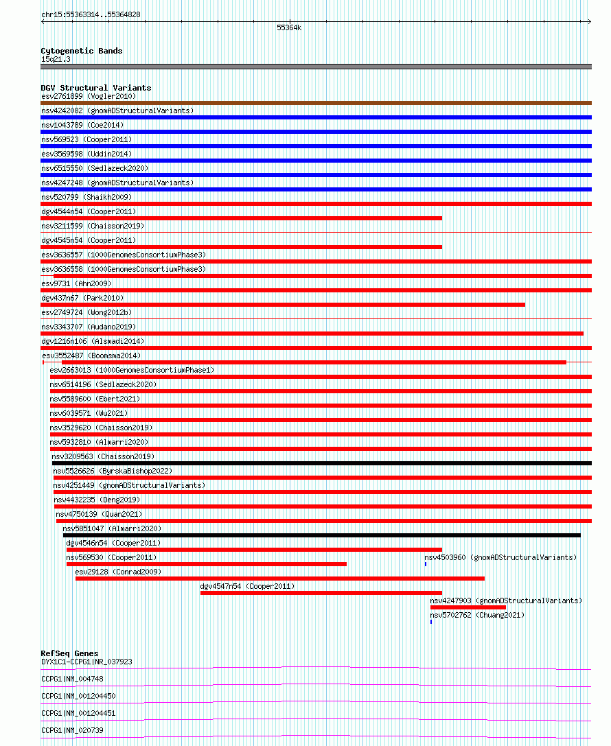 Variant DetailsVariant: nsv1135030| Internal ID | 19285994 | | Landmark | | | Location Information | | | Cytoband | 15q21.3 | | Allele length | | Assembly | Allele length | | hg38 | 1515 | | hg19 | 1515 |