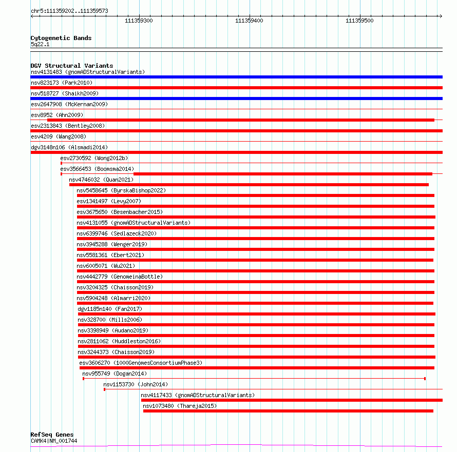 Variant DetailsVariant: nsv1135207| Internal ID | 19275754 | | Landmark | | | Location Information | | | Cytoband | 5q22.1 | | Allele length | | Assembly | Allele length | | hg38 | 372 | | hg19 | 372 |