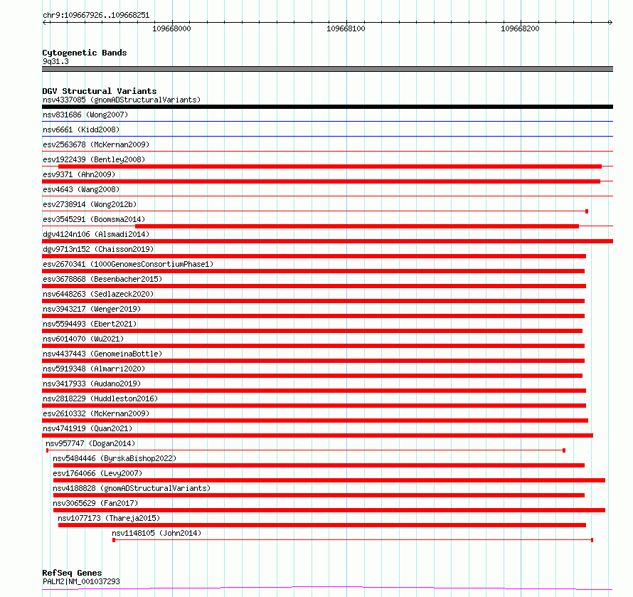 Variant DetailsVariant: nsv1135295| Internal ID | 19273097 | | Landmark | | | Location Information | | | Cytoband | 9q31.3 | | Allele length | | Assembly | Allele length | | hg38 | 326 | | hg19 | 326 |