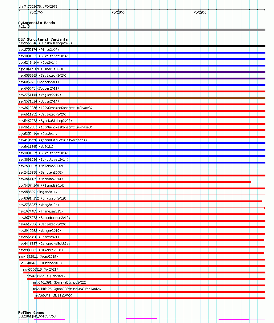 Variant DetailsVariant: nsv1135668| Internal ID | 19261315 | | Landmark | | | Location Information | | | Cytoband | 7p21.3 | | Allele length | | Assembly | Allele length | | hg38 | 301 | | hg19 | 301 |