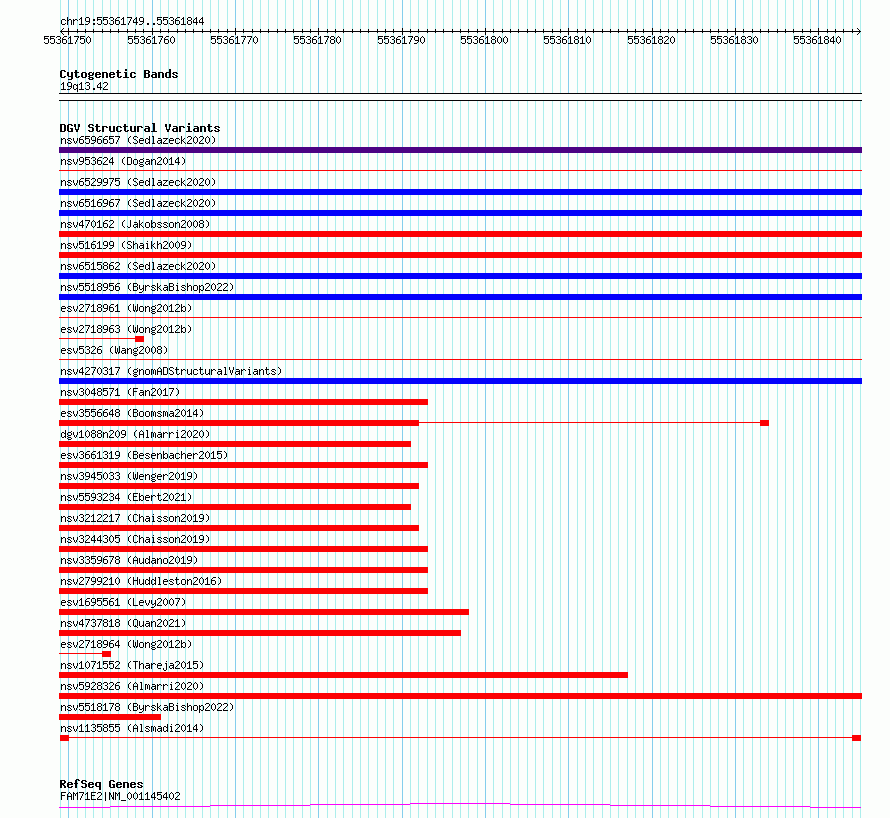 Variant DetailsVariant: nsv1135855| Internal ID | 19254531 | | Landmark | | | Location Information | | | Cytoband | 19q13.42 | | Allele length | | Assembly | Allele length | | hg38 | 96 | | hg19 | 96 |