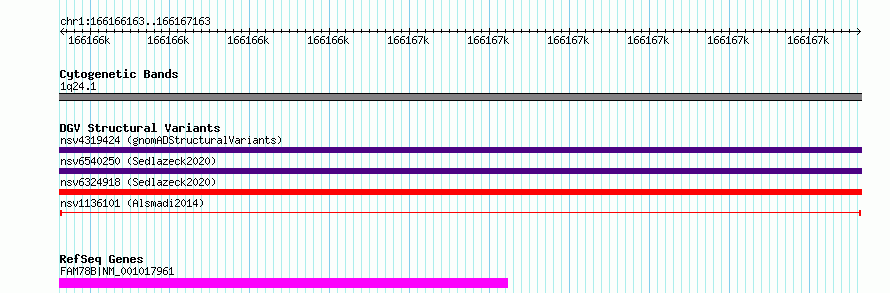 Variant DetailsVariant: nsv1136101| Internal ID | 19273211 | | Landmark | | | Location Information | | | Cytoband | 1q24.1 | | Allele length | | Assembly | Allele length | | hg38 | 1001 | | hg19 | 1001 |