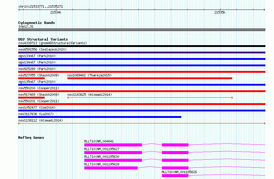 Variant DetailsVariant: nsv1136112| Internal ID | 19281563 | | Landmark | | | Location Information | | | Cytoband | 10p12.31 | | Allele length | | Assembly | Allele length | | hg38 | 1501 | | hg19 | 1501 |