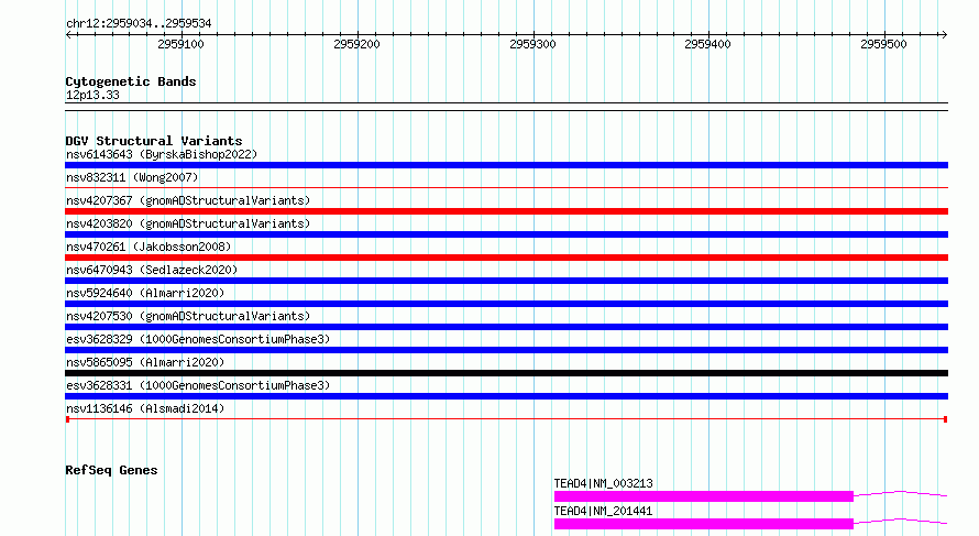 Variant DetailsVariant: nsv1136146| Internal ID | 19275578 | | Landmark | | | Location Information | | | Cytoband | 12p13.33 | | Allele length | | Assembly | Allele length | | hg38 | 501 | | hg19 | 501 |