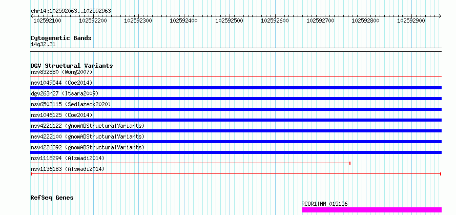 Variant DetailsVariant: nsv1136183| Internal ID | 19270857 | | Landmark | | | Location Information | | | Cytoband | 14q32.31 | | Allele length | | Assembly | Allele length | | hg38 | 901 | | hg19 | 901 |