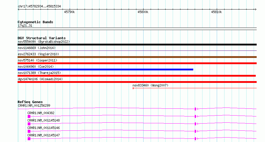 Variant DetailsVariant: nsv1136236| Internal ID | 19286002 | | Landmark | | | Location Information | | | Cytoband | 17q21.31 | | Allele length | | Assembly | Allele length | | hg38 | 32401 | | hg19 | 32401 |