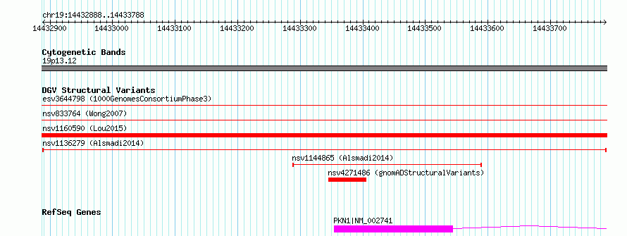 | Variant Type | CNV deletion | Copy Number | | Allele State | | Allele Origin | | Probe Count | | Validation Flag | | Merged Status | M | Merged Variants | | Supporting Variants | nssv3989896 | Samples | KWS2 | Known Genes | PKN1 | Method | Sequencing | Analysis | HugeSeq | Platform | Illumina HiSeq 2000 | Comments | | Reference | Alsmadi_et_al_2014 | Pubmed ID | 24896259 | Accession Number(s) | nsv1136279