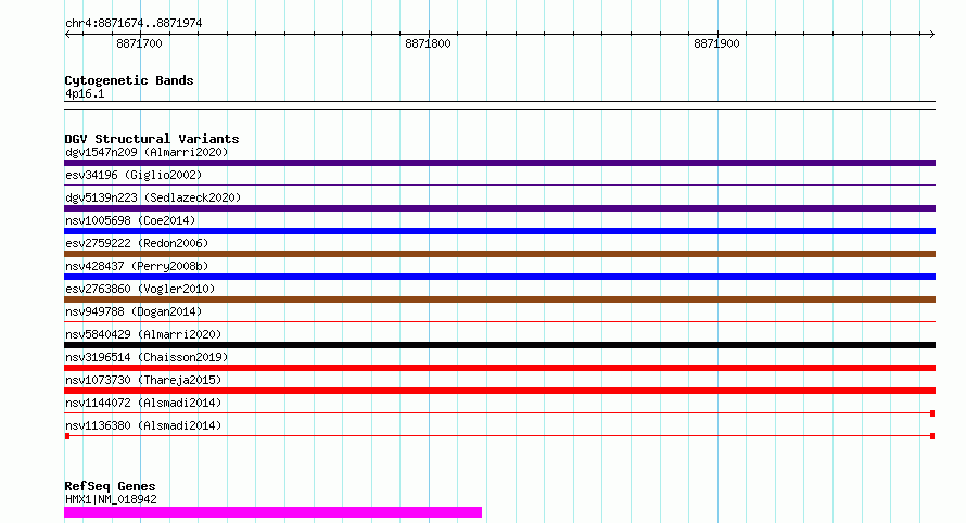 | | Variant Type | CNV deletion | | Copy Number | | | Allele State | | | Allele Origin | | | Probe Count | | | Validation Flag | | | Merged Status | M | | Merged Variants | | | Supporting Variants | nssv3990005 | | Samples | KWS2 | | Known Genes | HMX1 | | Method | Sequencing | | Analysis | HugeSeq | | Platform | Illumina HiSeq 2000 | | Comments | | | Reference | Alsmadi_et_al_2014 | | Pubmed ID | 24896259 | | Accession Number(s) | nsv1136380