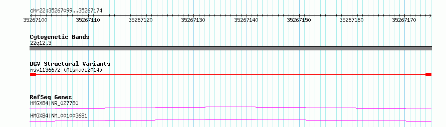 Variant DetailsVariant: nsv1136672| Internal ID | 19266632 | | Landmark | | | Location Information | | | Cytoband | 22q12.3 | | Allele length | | Assembly | Allele length | | hg38 | 76 | | hg19 | 76 |