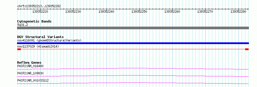 | Variant DetailsVariant: nsv1137029| Internal ID | 18924403 |  | Landmark |  |  | Location Information |  |  | Cytoband | 5q31.2 |  | Allele length | | Assembly | Allele length |  | hg38 | 70 |  | hg19 | 70 |