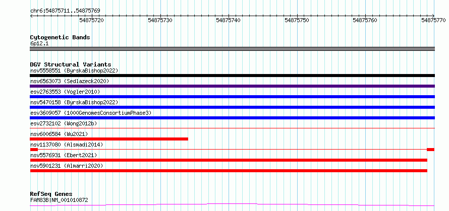Variant DetailsVariant: nsv1137080| Internal ID | 19273124 | | Landmark | | | Location Information | | | Cytoband | 6p12.1 | | Allele length | | Assembly | Allele length | | hg38 | 59 | | hg19 | 59 |