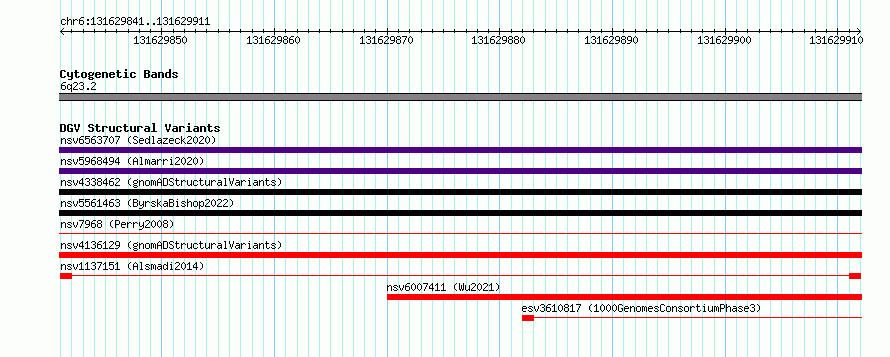 Variant DetailsVariant: nsv1137151| Internal ID | 19279312 | | Landmark | | | Location Information | | | Cytoband | 6q23.2 | | Allele length | | Assembly | Allele length | | hg38 | 71 | | hg19 | 71 |