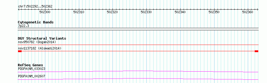 | | Variant Type | CNV deletion | | Copy Number | | | Allele State | | | Allele Origin | | | Probe Count | | | Validation Flag | | | Merged Status | M | | Merged Variants | | | Supporting Variants | nssv3975874 | | Samples | KWS2 | | Known Genes | PDGFA | | Method | Sequencing | | Analysis | HugeSeq | | Platform | Illumina HiSeq 2000 | | Comments | | | Reference | Alsmadi_et_al_2014 | | Pubmed ID | 24896259 | | Accession Number(s) | nsv1137182