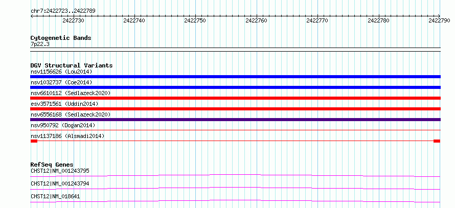 Variant DetailsVariant: nsv1137186| Internal ID | 19276080 | | Landmark | | | Location Information | | | Cytoband | 7p22.3 | | Allele length | | Assembly | Allele length | | hg38 | 67 | | hg19 | 67 |