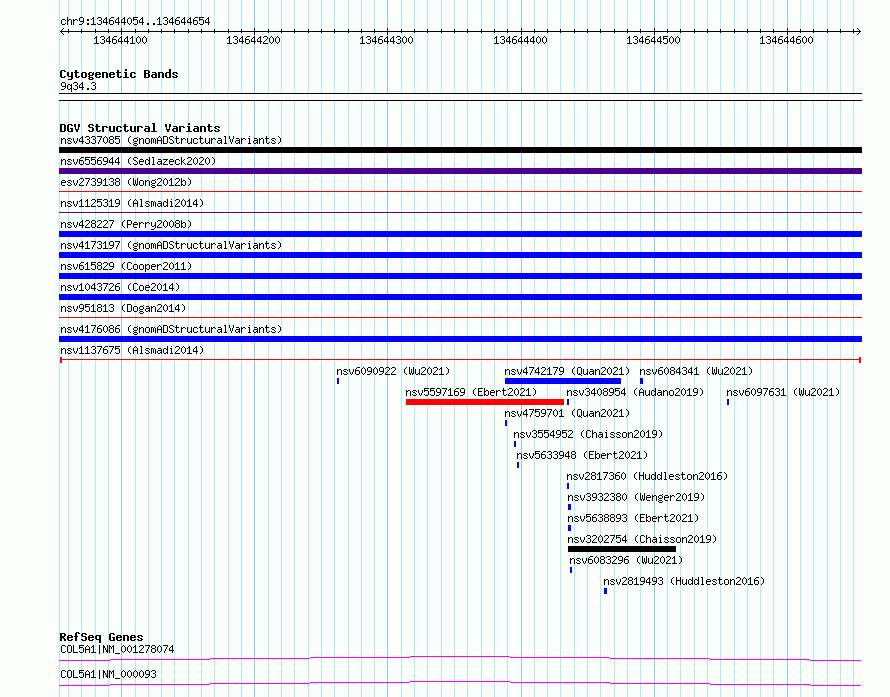 Variant DetailsVariant: nsv1137675| Internal ID | 19270484 | | Landmark | | | Location Information | | | Cytoband | 9q34.3 | | Allele length | | Assembly | Allele length | | hg38 | 601 | | hg19 | 601 |