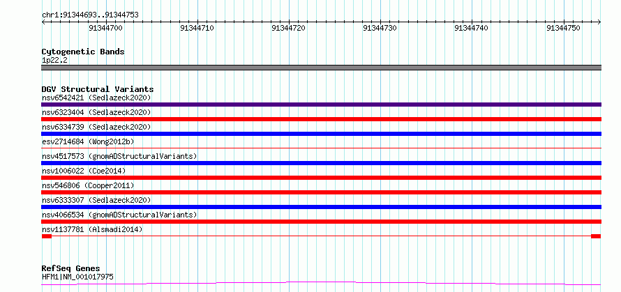 Variant DetailsVariant: nsv1137781| Internal ID | 19261616 | | Landmark | | | Location Information | | | Cytoband | 1p22.2 | | Allele length | | Assembly | Allele length | | hg38 | 61 | | hg19 | 61 |