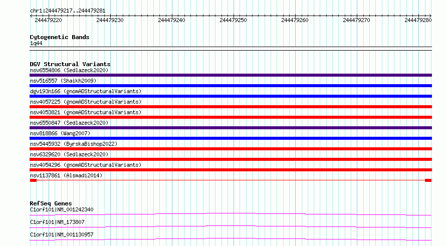 Variant DetailsVariant: nsv1137861| Internal ID | 19259951 | | Landmark | | | Location Information | | | Cytoband | 1q44 | | Allele length | | Assembly | Allele length | | hg38 | 65 | | hg19 | 65 |