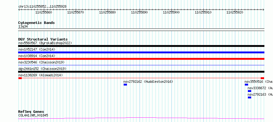 Variant DetailsVariant: nsv1138269| Internal ID | 19276395 | | Landmark | | | Location Information | | | Cytoband | 13q34 | | Allele length | | Assembly | Allele length | | hg38 | 77 | | hg19 | 77 |