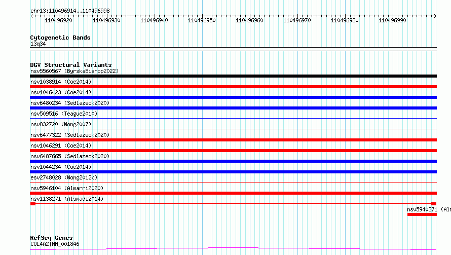 Variant DetailsVariant: nsv1138271| Internal ID | 19257610 | | Landmark | | | Location Information | | | Cytoband | 13q34 | | Allele length | | Assembly | Allele length | | hg38 | 85 | | hg19 | 85 |