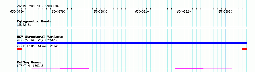 Variant DetailsVariant: nsv1138380| Internal ID | 18901334 | | Landmark | | | Location Information | | | Cytoband | 15q22.31 | | Allele length | | Assembly | Allele length | | hg38 | 55 | | hg19 | 55 |